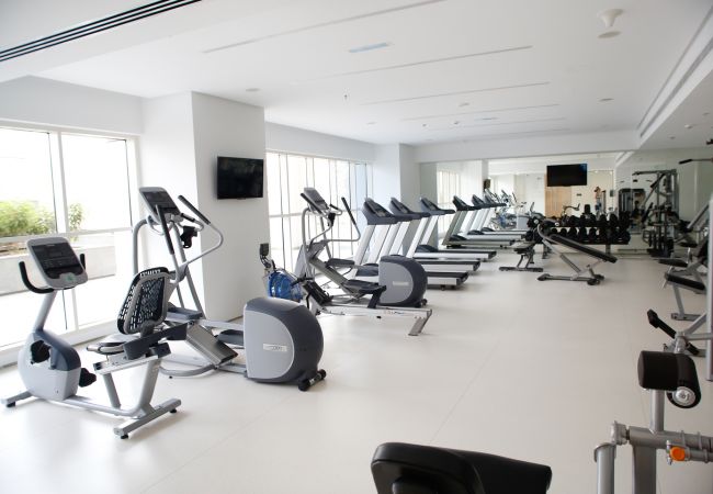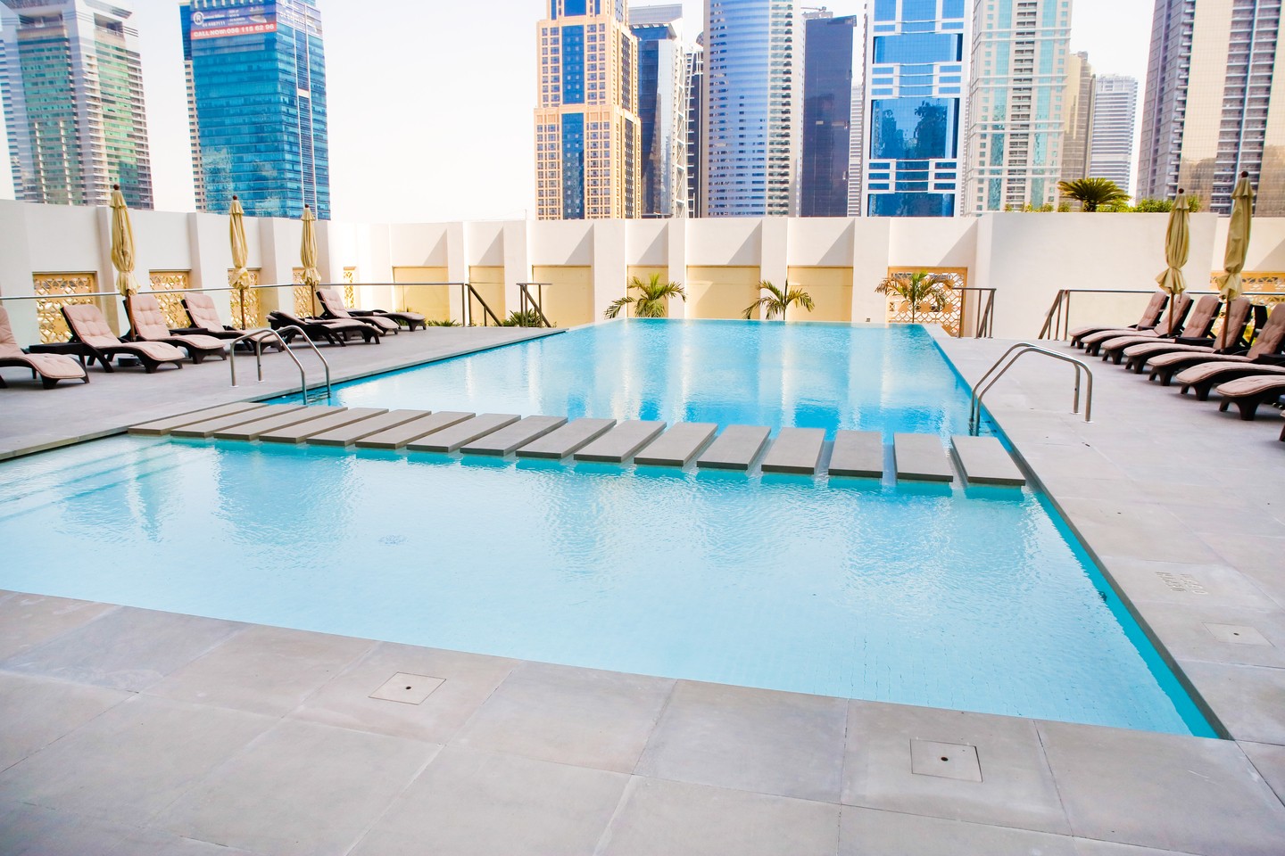 The modern interiors emphasize the beautiful views on the water, while also offering all comforts and amenities required by our guests. The building also boasts world-class facilities, from the large outdoor swimming pool, to the full appointed gym.